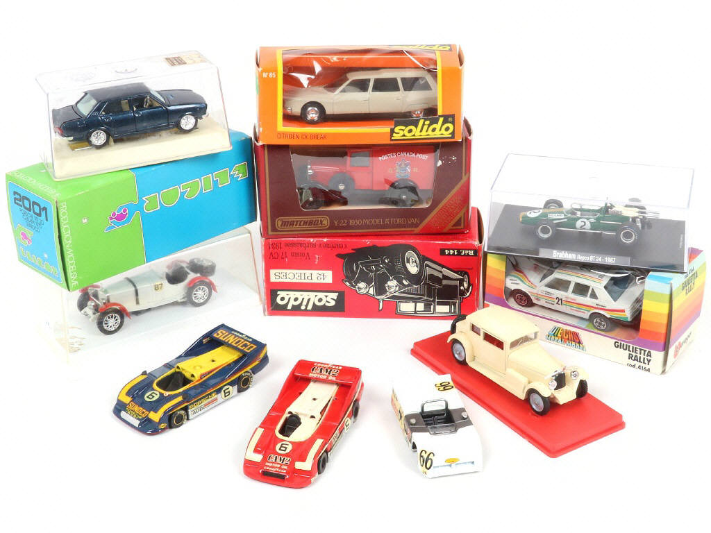 on y retrouve notamment les marques : SOLIDO (un accessoire cassé & incomplet sur un exemplaire), BBURAGO & ELIGOR - un exemplaire sans boîte