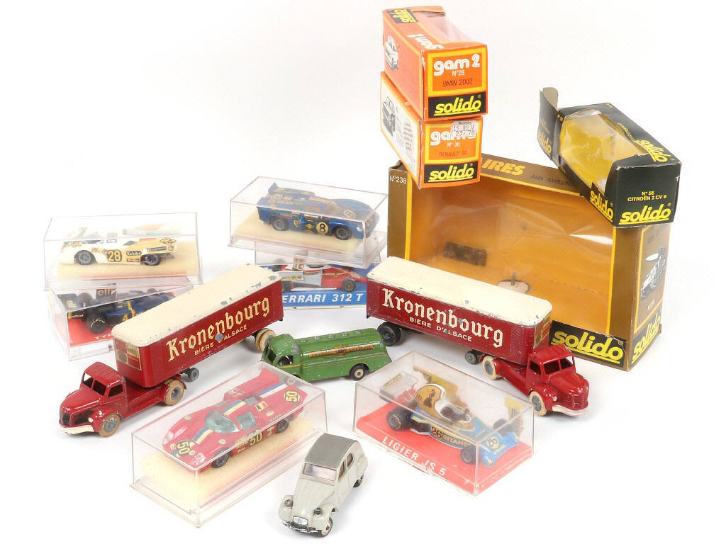 on y retrouve notamment les marques : JRD (un toit de fourgon repeint), CHAMPION & C.I.J - on y joint 4 boîtes vides de la marque SOLIDO - les boîtes présentées sont en état 'a' à 'c' - quelques petits manques