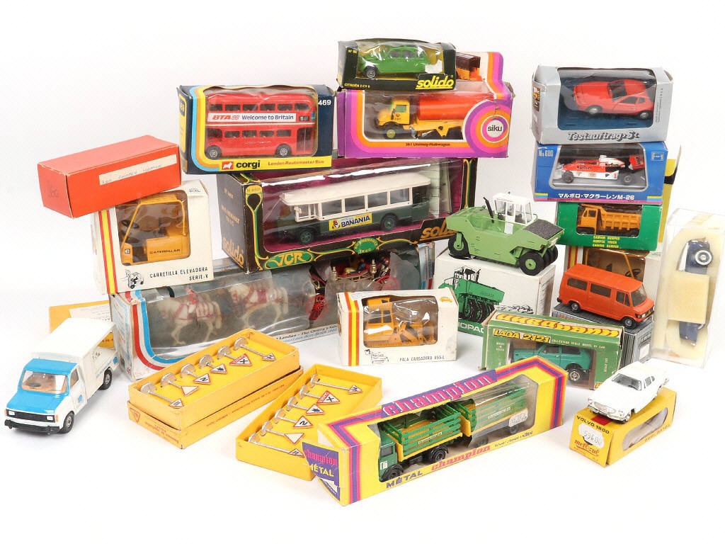 les boîtes sont en état 'b' à 'd' - on y retrouve notamment les marques : CHAMPION, SIKU & RIO - semblent complets - parties désolidarisées sur la LADA (inscriptions sur l'intérieurs des rabat OTK 900 & date 1983) - petites traces d'humidité sur un exemplaire