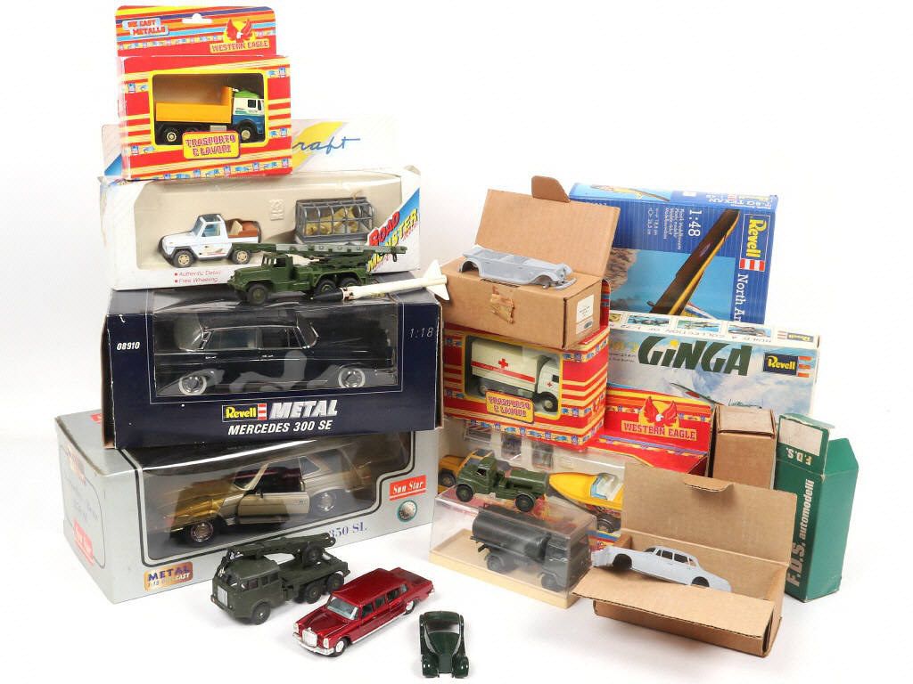 on y retrouve notamment les marques : REVELL & DINKY TOYS - quelques petits manques & parties cassées sur certains exemplaires - les boîtes présentées sont en état 'b' & 'c' (certains exemplaires sans boîte) - 3 modèles à monter semblent complets