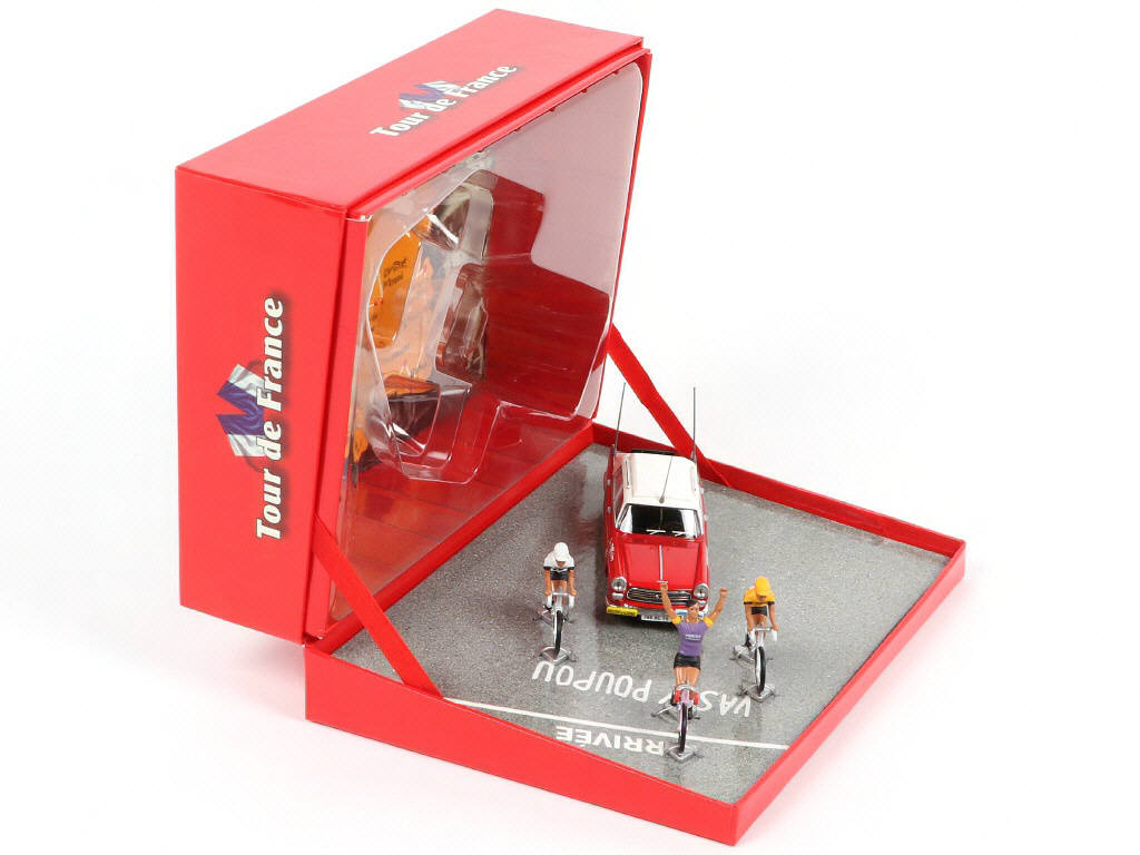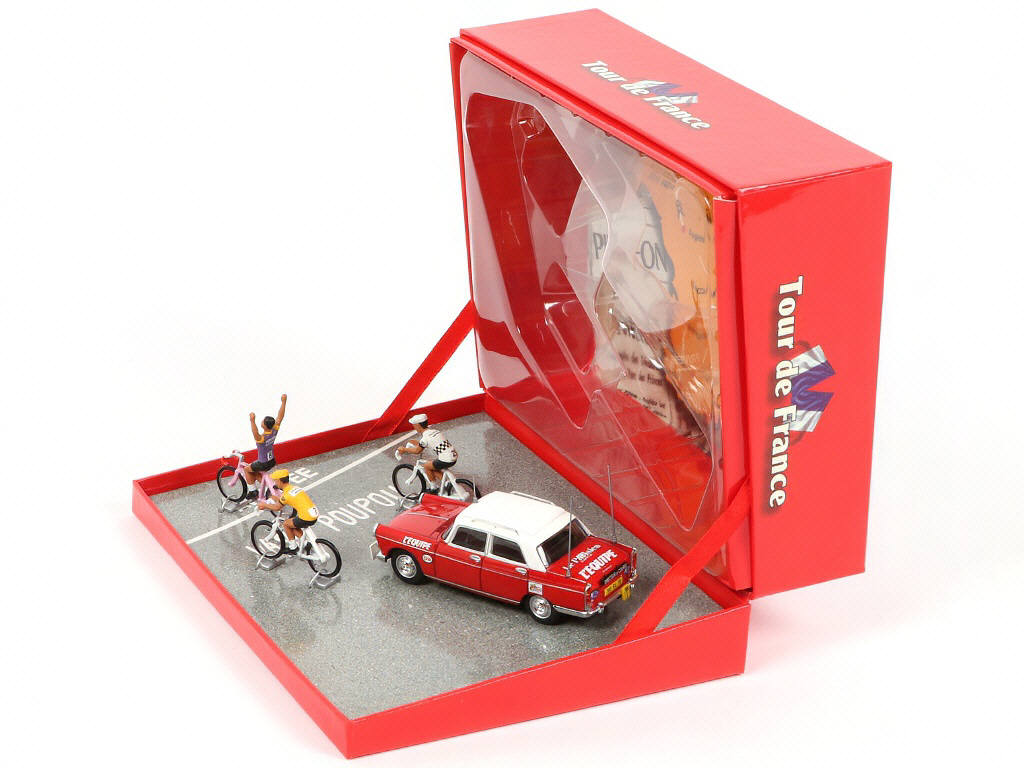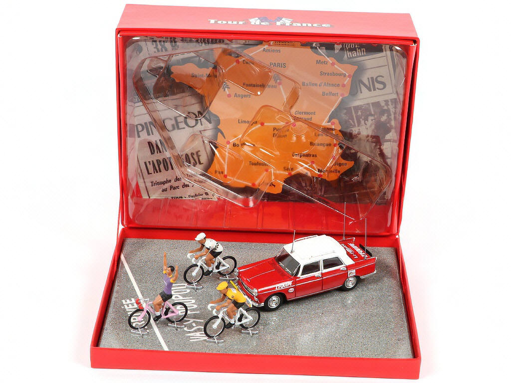 contient un PEUGEOT 404 & 3 cyclistes - avec sur emballage en carton