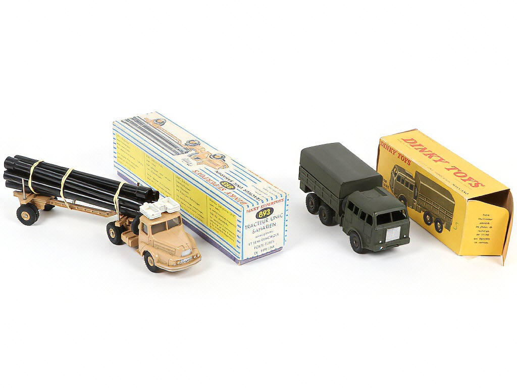 DINKY TOYS (FRANCE) 893 UNIC Saharien transport de pipe-lines (version avec jantes concaves & remorque ajourée) sable & blanc