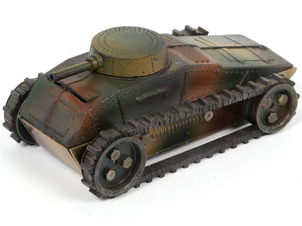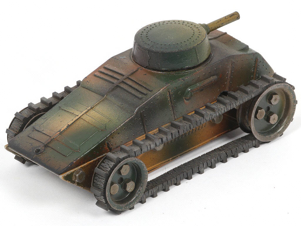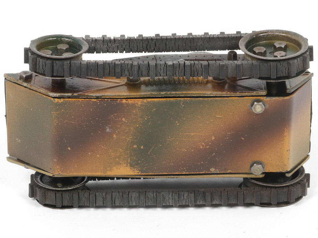 longueur : 13 cm - moteur à clef fonctionne - chenilles craquelées - petites traces de métal fatigue sur la tourelle