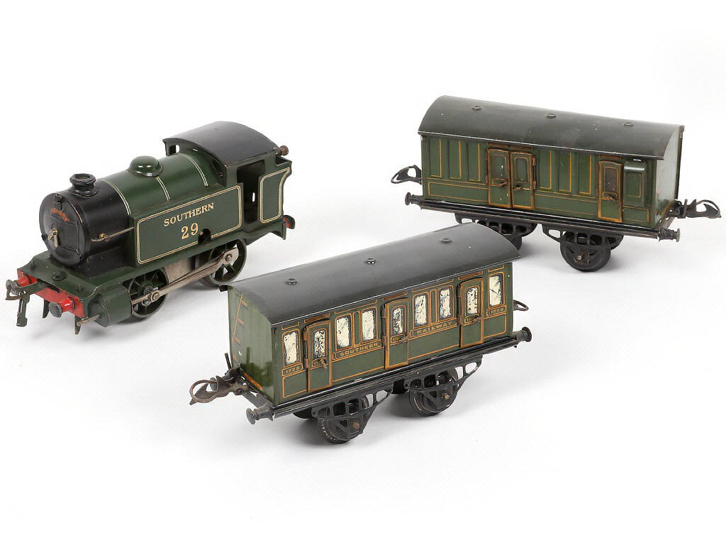 moteur à clef (à revoir) - extrémités de tiges non d'origine - un tampon restauré - sans lanterne - on y joint 2 matériels ferroviaires de la marque