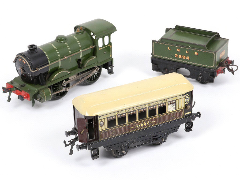 moteur à clef (fonctionne) - quelques retouches - sans lanterne - manque un accessoire sur le tender - on y joint une voiture PULLMAN de la marque