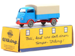 WIKING (ALLEMAGNE) TEMPO Camion-plateau bâché bleu ciel, rouge & beige