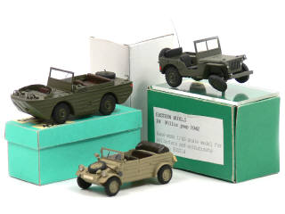 comprend : JEEP, JEEP amphibie & VOLKSWAGEN KUBELWAGEN - un modèle avec un demi-train recollé de travers - petits manques - un cerclage de volant cassé - une boîte en état 'c'