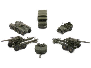 DINKY TOYS (FRANCE) Ensemble de 3 véhicules militaires, 2 canons & une remorque kaki