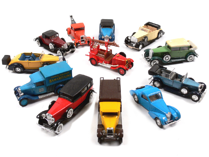états de 'B' à 'F' - miniatures reproduisant les modèles : PACKARD, DELAHAYE, CITROËN, DUESENBERG, CADILLAC, JAGUAR, FIAT, ROLLS ROYCE & CORD - petits manques