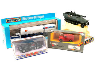 miniatures reproduisant les modèles : DELAHAYE, MORRIS, PETERBILT & SDKFZ 251 (une chenille recollée & grappe d'obus incomplète) - on y retrouve les marques : MATCHBOX, DINKY MATCHBOX, DINKY TOYS GB & CORGI TOYS - un véhicule avec boîte en état 'D'