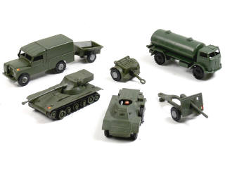 série 'MICROMINIATURE' - états de 'A' à 'B' - comprend notamment : FERRET, AMX 13T, LAND ROVER (pellicule grise des jantes en partie effacée) - un véhicule de la marque SAM TOYS (axes de roues oxydés) - attelage d'une remorque recollé