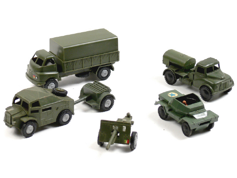 états de 'B' à 'C' - comprend : BEDFORD, SCOUT CAR, tracteur d'artillerie & tonne d'eau - on y retrouve les marques : POLITOYS & SAM TOYS - une fixation de remorque incomplète & 3 autres cassées - quelques traces d'oxydation sur les axes de roues