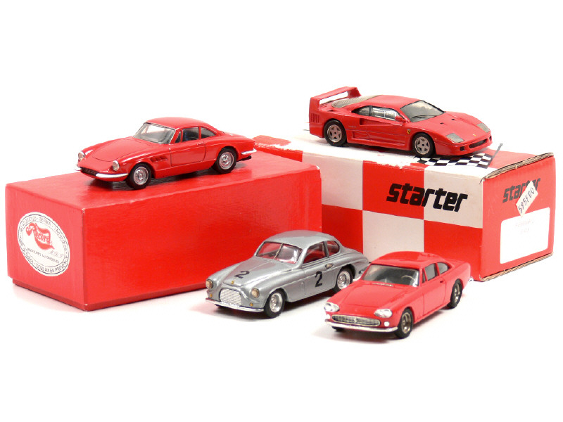 miniatures reproduisant les modèles : 330 GTC, F40, 330 GT (un axe de roues cassé) & 166 INTER VIGNALE - on y retrouve les marques : CHALLANGE, RECORD & STARTER - petits manques - 2 voitures en boîte