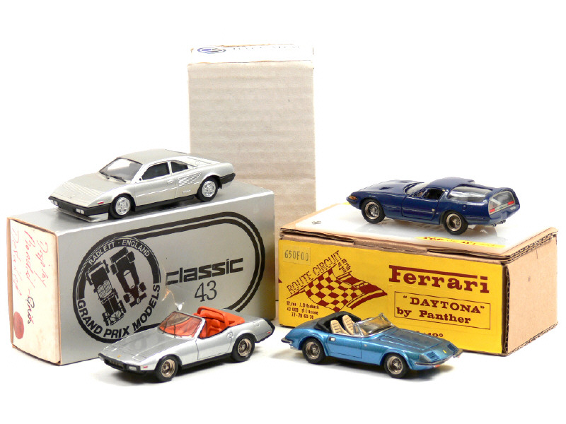 miniatures reproduisant les modèles : DAYTONA-PANTHER (2 éléments décollés), 3Z ZAGATO, SPIDER NART (vitre de pare-brise à recoller) & MONDIAL 8 - on y retrouve les marques : GRAND PRIX MODELS, SPEED WAY, ROUTE CIRCUIT 43 & BAL CAR - petits manques - une boîte en état 'c' - une voiture sans boîte