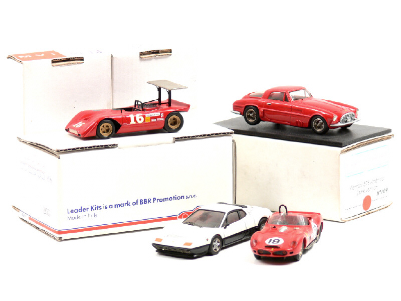 miniatures reproduisant les modèles : 612 CANAM (état 'A-', manque un rétroviseur, 2 fixations d'aileron à recoller), 375 AMERICA, 330 TRI & BB 512 - on y retrouve les marques : ANNECY MINIATURES, STARTER, HECO MODELES & BBR - 2 boîtes non conformes