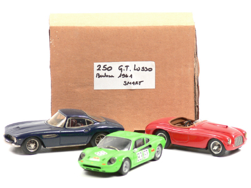 miniatures reproduisant les modèles : 250 GT LUSSO BERTONE (plancher numéroté 274), 246 GT DINO (série limitée numérotée 34/250 exemplaires) & 166 MM - on y retrouve les marques : CHALLANGE, NESTOR & SMART - une voiture avec boîte non d'origine