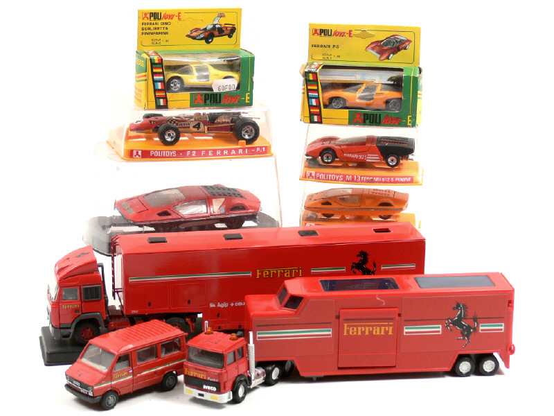 miniatures reproduisant notamment les modèles : P5, DINO BERLINETTA, 512S, 512 MODULO & IVECO (pour les camions & l'utilitaire) - on y retrouve les marques : POLITOYS, OLDCARS, MATCHBOX & EVRAT - petits manques - 6 voitures en boîte - 2 FERRARI grandes échelles