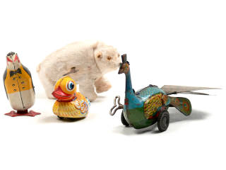 états de 'B' à 'D' - comprend : un pingouin, un caneton, un ours polaire & un paon (mécanisme à revoir) - on y retrouve notamment les marques : JOUSTRA & LEHMANN - avec 2 clefs