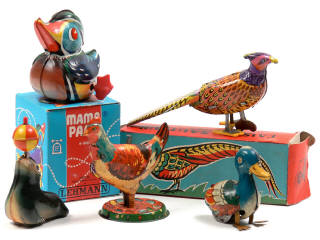 états de 'A' à 'B' - comprend : 2 canards, un faisan, une otarie avec son ballon & un coq - 2 modèles avec boîte - on y retrouve notamment les marques : LEHMANN & MONT BLANC - avec une clef
