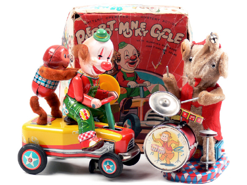 longueur 20 cm - moteur à piles (fonctionne) - avec cale de boîte - en action, le véhicule avance en zigzaguant & en contournant les obstacles tandis que les personnages bougent d'avant en arrière & que le nez du clown s'allume - avec sonnerie - une trace d'oxydation sur la trappe du compartiment des piles