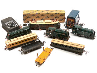 L.R. (FRANCE) Ensemble de 3 locomotives-tender, 2 voitures de voyageurs, 2 wagons, une motrice & 2 transformateurs