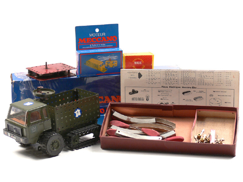 états de 'A' à 'D' - comprend : une boîte complémentaire référence 218X, une boîte n°5, une boîte n°3 (sous film plastique en partie déchiré avec 2 pièces manquantes), un moteur électrique référence 032230 (avec boîte), un moteur mécanique 'MAGIC' référence 032226 (avec boîte), un moteur à clef (fonctionne) & 2 tarifs plastifiés de 1963