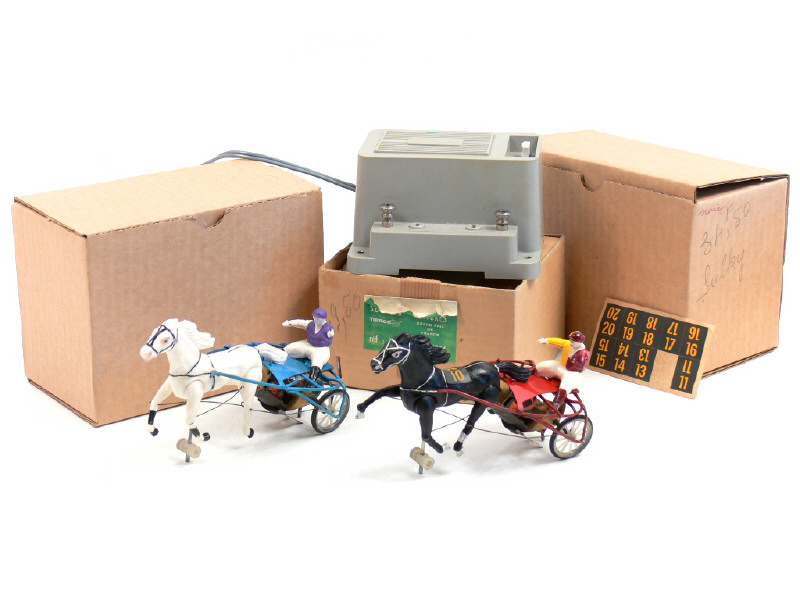avec planche de numéros autocollants - un bras sur le jockey & rênes manquants - avec suremballage de protection - quelques petites traces d'oxydation - on y joint un transformateur avec sa boîte, une notice 'TIERCE 24' & un carnet de fiches de paris