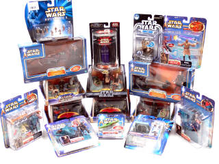comprend notamment : ANAKIN SKYWALKER, DARTH TYRANUS'S, R2-D2, DARTH MAUL, YODA, KUI-GON JINN, KI-ADI MUNDI, MACE WINDU, EVEN PIELL, OPPO RANCISIS, NUTE GUNRAY, SHU MAI, PASSEL ARGENTE, YARAEL POOF, DEPA BILLABA, YADDLE, POGGLE THE LESSER & SAN HILL - figurines sous boîte-blister jamais ouvert