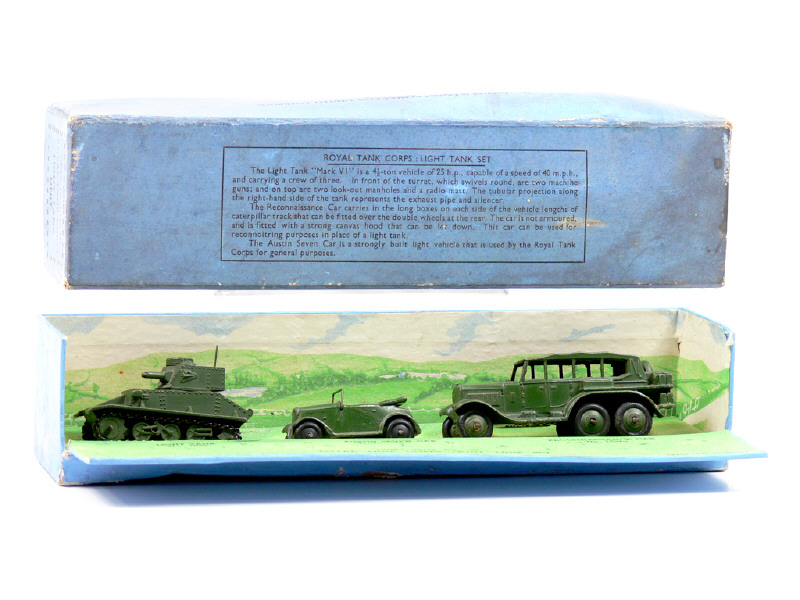 coffret produit de 1937 à 1941 - contient : un char léger (référence 152A), une voiture de reconnaissance (référence 152B en état 'D' avec 2 pneus légèrement affaissés) & une AUSTIN SEVEN (référence 152C avec traces de métal fatigue & conducteur manquant) - boîte tachée & déformée - avec cale