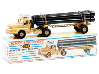 DINKY TOYS (FRANCE) 893 UNIC Saharien transport de pipe-lines (version avec jantes convexes & remorque ajourée) sable & blanc