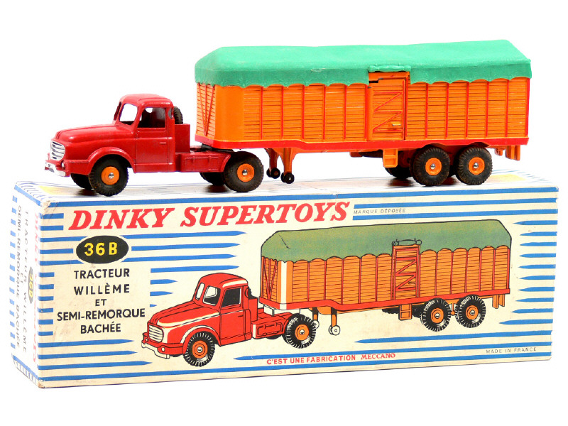 DINKY TOYS (FRANCE) 36B WILLEME Semi-remorque bâché (version avec jantes convexes) rouge & orange, bâche verte