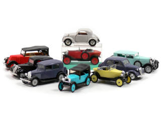 comprend : CITROËN 5HP (2 exemplaires dont un avec boîte), CITROËN 11A, PEUGEOT 172R, PEUGEOT 201, SIMCA 5, SIMCA 1200, RENAULT NN1 & PANHARD 35 CV