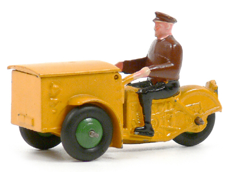 DINKY TOYS (FRANCE) 14A Triporteur (dernière version avec roues à pneus 'M') jaune, jantes vertes & pilote à chemise marron