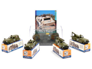 comprend : une ambulance, une dépanneuse, un break 'SIGNAL CORPS' & une voiture d'état-major - avec 2 dépliants présentant les différents modèles de la marque - on y joint un TPZ 1 FUCHS de l'armée allemande 1998 de la marque ATLAS sous boîte-vitrine avec descriptif illustré