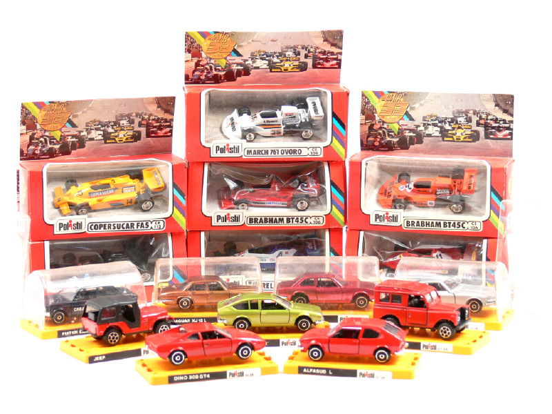 comprend : MARCH 761 OVORO, BRABHAM BT 45C (2 exemplaires différents), TYRREL 008, COPERSUCAR FA5, LOTUS JPS 78, FERRARI 312 T3, NISSAN DATSUN, FIAT 131 CARABINIERI, JAGUAR XJ12 L, PEUGEOT 504 COUPE, FERRARI DINO 308 GT4, ALFA ROMEO ALFETTA, JEEP, LAND ROVER & ALFA ROMEO ALFASUD - quelques boîtes en état 'c'
