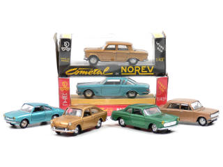 série 'COMETAL' - miniatures reproduisant les modèles : FIAT, PEUGEOT, SIMCA & VOLKSWAGEN - 2 véhicules en boîte dont une non conforme (état 'c') - manque un volant & une extrémité de pare-chocs