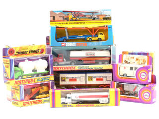 miniatures reproduisant les modèles : DAF, CATERPILLAR, SCAMMELL, PEGASO, MAGIRUS, MERCEDES, MACK & FORD - on y retrouve les marques : CORGI TOYS, CHAMPION, MATCHBOX, MIRA & SIKU - 3 boîtes en état 'c' - manque quelques autocollants sur un camion
