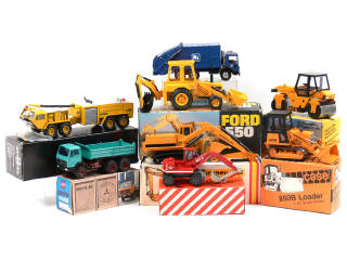 miniatures reproduisant les modèles : CATERPILLAR, FORD, CASE, O&K, VOEST-ALPINE, OSHKOSH-ROSENBAUER, MERCEDES & MAC - on y retrouve les marques : JOAL, CONRAD, GESCHA & NZG - quelques petits manques - 4 boîtes en état 'c'
