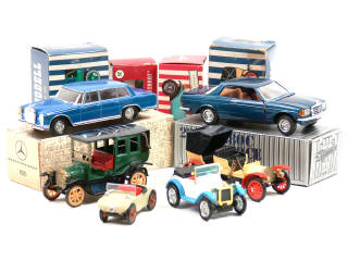comprend : HANOMAG KOMMISSBROT, BMW DIXI, BENZ, MERCEDES SIMPLEX, MERCEDES 600 (retouches d'usine) & MERCEDES 230C - on y retrouve les marques : CONRAD & ZISS MODELL - 2 boîtes en états 'c' & une autre en état 'd'