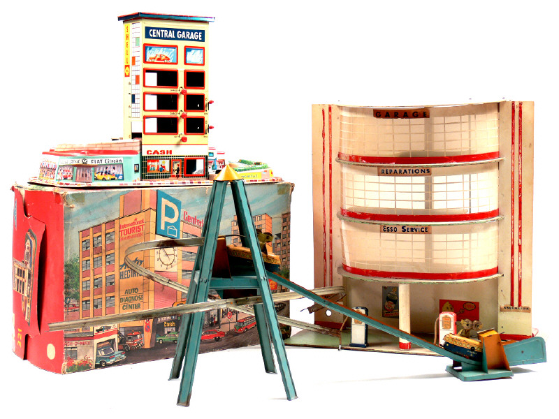 dimensions : 44 x 23 x 29 cm - avec ascenseur électrique (fonctionne) & 2 voitures en tôle lithographiée