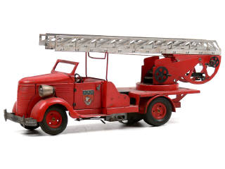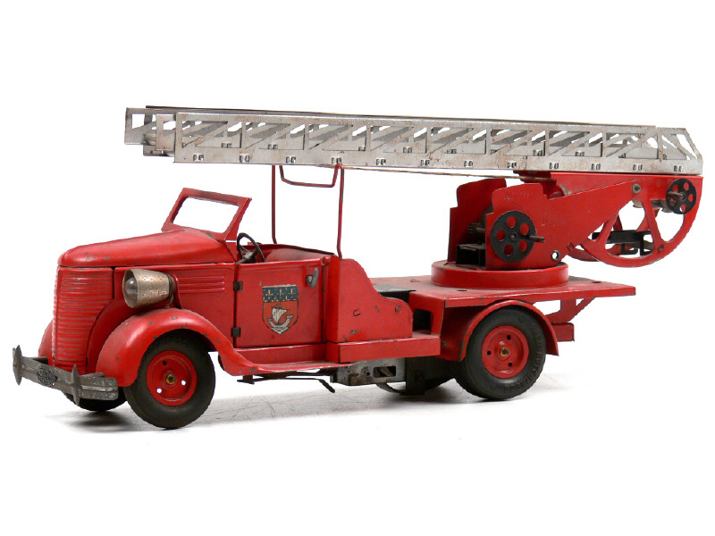 longueur 39 cm - moteur à clef (fonctionne) & phares électriques (une ampoule à revoir) - manque pompiers & une poignée de portière - légères traces d'oxydation sous le châssis - chromes ternis