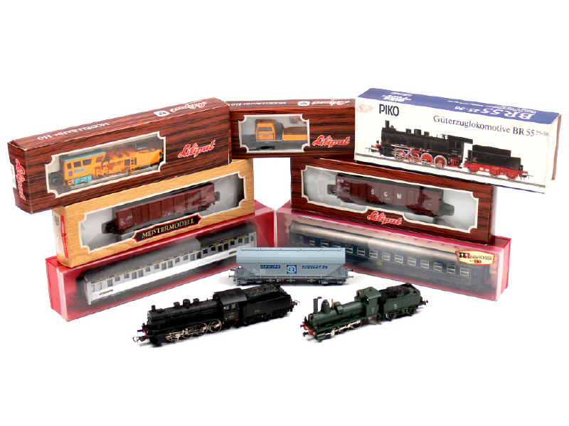 comprend : 2 locomotives vapeur type 040 & 030 avec tenders, 3 wagons de marchandises, 2 voitures de voyageurs & 2 engins de maintenance des voies - on y retrouve les marques : RIVAROSSI, PIKO & LILIPUT