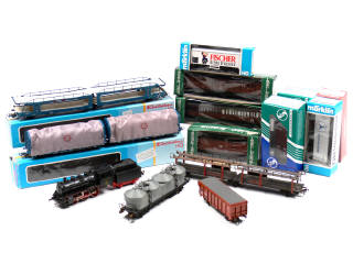 comprend : une lomotive vapeur type 030 avec tender, 11 wagons de marchandises & une voiture de voyageurs - on y retrouve les marques : MÄRKLIN, KLEIN MODELLBAHN, SACHSEN MODELLE, ELECTROTREN, ELEC TRAINS & FLEISCHMANN - 2 boîtes en état 'c' - 3 modèles sans boîte dont 2 en état 'D' avec traces d'oxydation