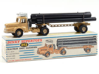 DINKY TOYS (FRANCE) 893 UNIC Saharien transport de pipe-lines (version avec jantes convexes & remorque ajourée) sable & blanc