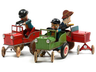 longueur 20 cm - moteurs à ressort (fonctionnent) - en action les véhicules avancent & reculent dans toutes les directions tandis que les personnages sont secoués d'avant en arrière - une roue non d'origine - traces d'oxydation - on y joint un modèle similaire de marque indéterminée réalisé en bois