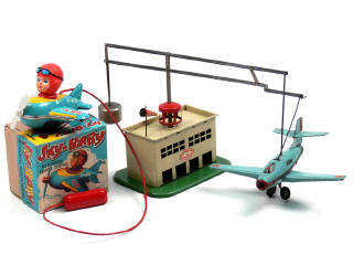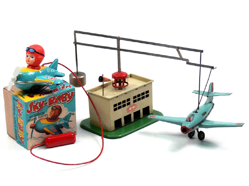 dimensions : 45 x 19 cm - moteur à clef (fonctionne) - avec clef - en action, l'avion décolle, rentre ses roues, tourne, ressort ses roues & atterrit - parties nickelées ternies - train d'atterrissage non fonctionnel - on y joint un petit avion téléguidé de la marque FUJI PRESS KOGYOSHO avec sa boîte (moteur à ressort à revoir)