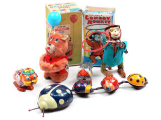 états de 'A' à 'C' - comprend 2 singes, un ours, une coccinelle & un oiseau - on y retrouve notamment les marques : FUJI PRESS KOGYOSHO, LEHMANN, YONE & K - tous les modèles fonctionnent dont 2 avec boîte