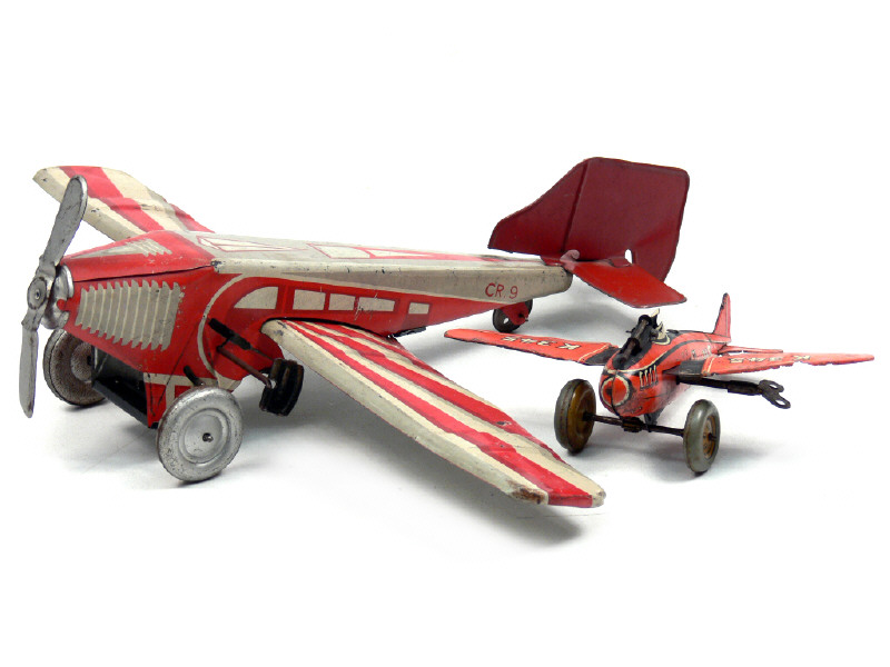 moteur à ressort (fonctionne) - manque 2 agrafes d'empennage - quelques traces d'oxydation (notamment sur le moteur) - système de fixation d'aile non d'origine - on y joint un petit monoplan à ailes repliables de marque la marque KELLERMAN en état 'D' avec retouches, parties repeintes & traces d'oxydation - manque une partie de la tête du pilote