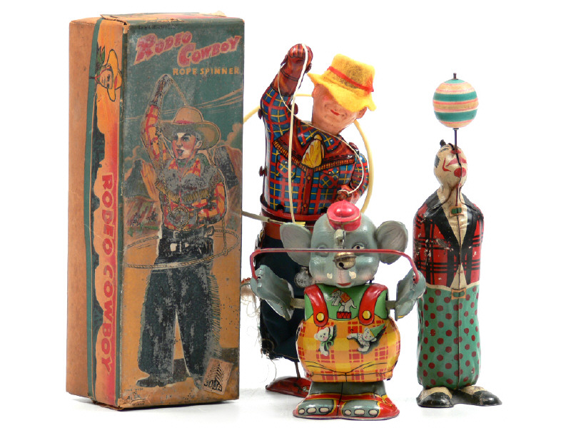 états de 'B' à 'D' - comprend : un cow-boy avec son lasso (moteur à ressort à revoir & boîte présente) de la marque JOJA, un clown avec ballon sur le nez (moteur à clef fonctionne) & un éléphant sautant à la corde (moteur à clef fonctionne)