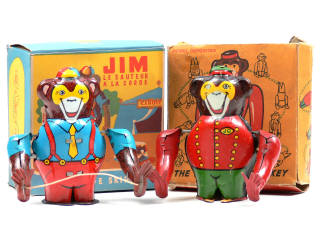 JOUSTRA (FRANCE) 1015 JIM, le singe sauteur à la corde en tôle lithographiée rouge & bleu